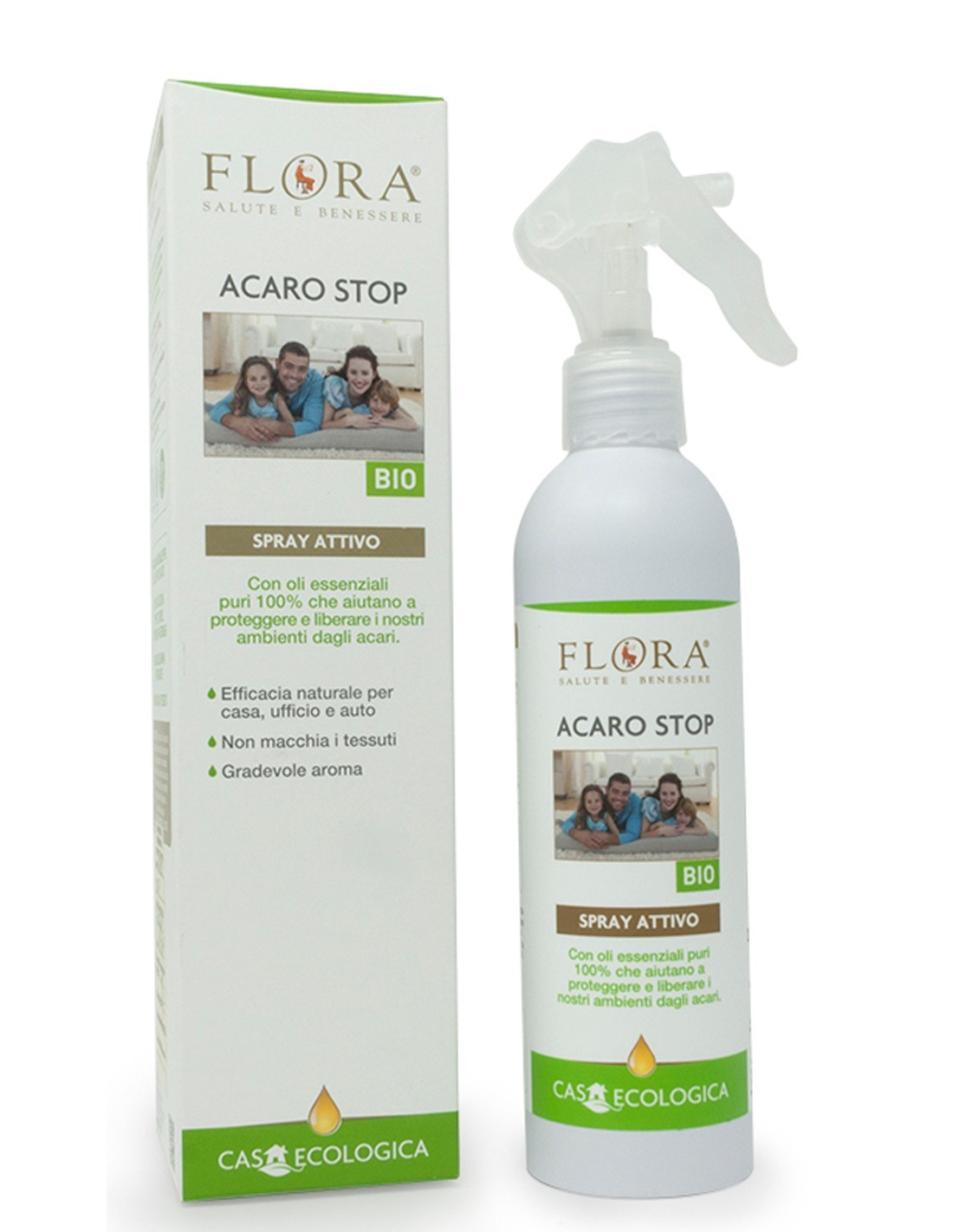 Lo spray ambiente Acaro Stop crea un ambiente sfavorevole all’insediamento degli acari della polvere (tra i più comuni, Dermatophagoides pteronyssinus). L’efficacia è garantita dalla presenza degli oli essenziali 100% puri, naturali e totali, accuratamente selezionati per la loro nota attività purificante. La presenza dell’olio vegetale di neem, ottenuto per spremitura a freddo dai semi dell’Azadirachta indica, va a potenziare l’effetto della formulazione. Attivo su cuscini, tappeti, tende, poltrone e materassi. NON MACCHIA I TESSUTI. L’efficacia è stata testata presso i ”Laboratori Archa” di Pisa, per i tessuti asciutti.