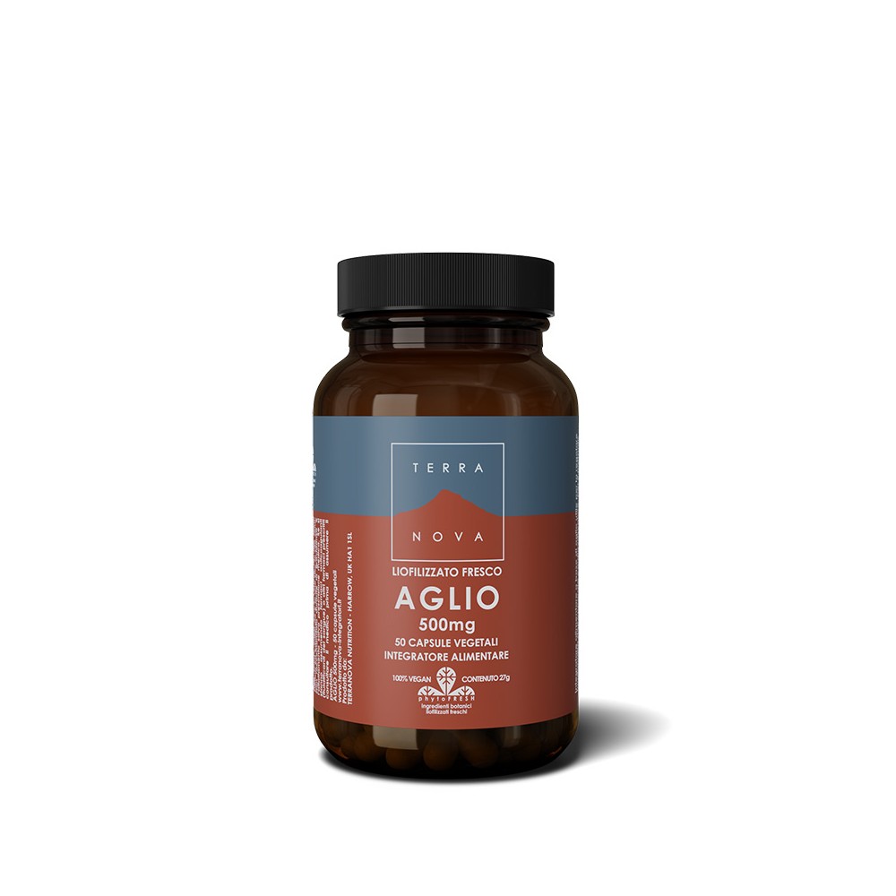 L’Aglio e` una delle piante piu` conosciute nella fitoterapia occidentale, rappresenta uno dei componenti principe della dieta mediterranea. La parti della pianta usate sono i bulbi, che Terranova liofilizza in modo da mantenere l’intero fitocomplesso. L’aglio contiene diversi composti solforati, tra cui spicca l’allicina, quale si origina dall’alliina grazie all’enzima allinasi, e questi composti solforati presentano azione antiossidante, mantengono la funzionalità dell’apparato cardiovascolare e la normale pressione sanguigna.