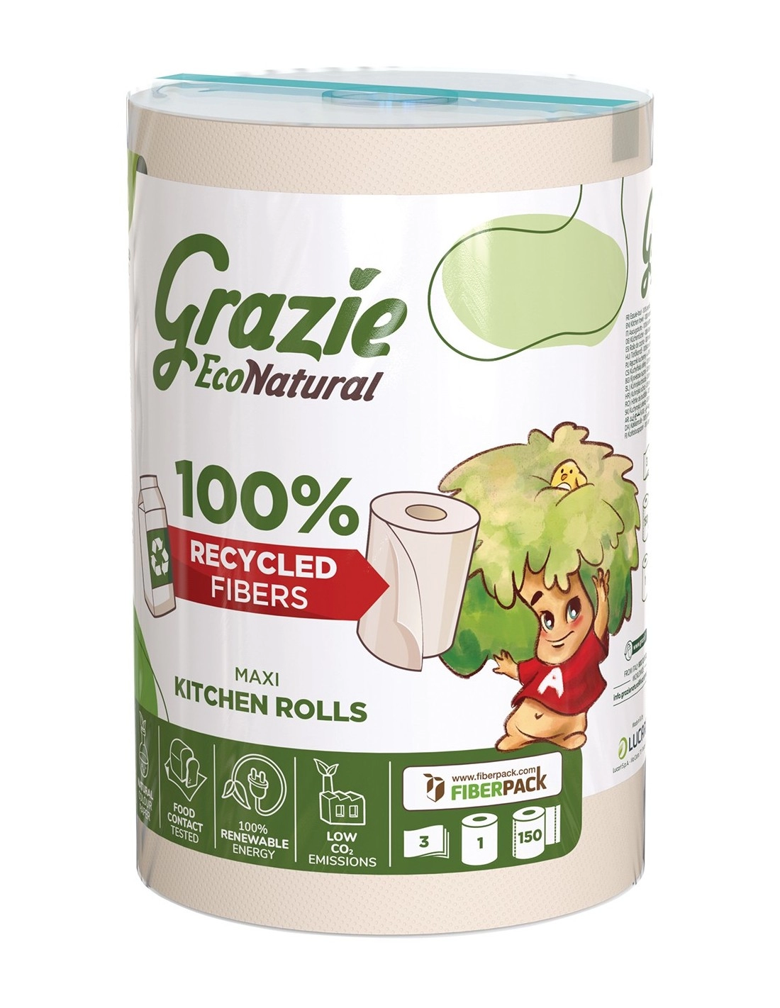 L’Asciugatutto Maxirotolo Grazie Natural è un rotolo di carta assorbente realizzata in fibra 100% riciclata dai cartoni per bevande. Proprio perché non trattata, presenta di sua natura una colorazione più scura del normale. Certificato Ecolabel, l’Asciugatutto è disponibile nel maxi formato da 150 strappi da 3 veli ciascuno, per garantire extra resistenza e ultra assorbenza.
