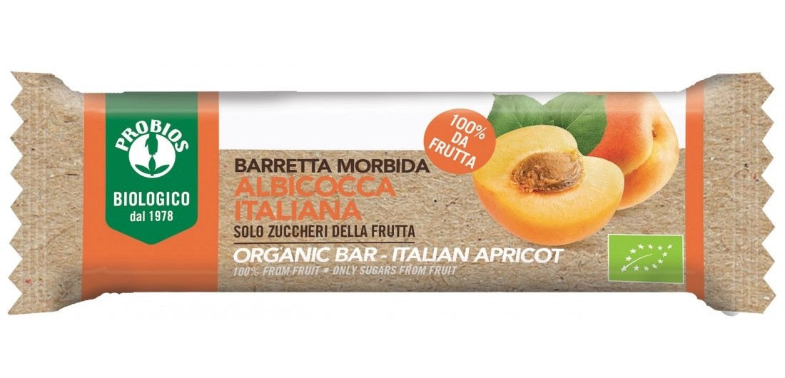 Barretta morbida Albicocca italiana Probios è una barretta realizzata da 100% frutta, con albicocca italiana biologica (non contiene farine). Snack perfetto per assaporare tutto il buono della frutta in qualsiasi momento della giornata, ti darà la giusta energia grazie ai soli zuccheri naturali della frutta. senza grassi e garantita senza glutine. Una barretta contiene solo 80kcal! Disponibile in formato da 28g, anche nei gusti Pesca italiana e Frutti di bosco italiani: cosa aspetti a provarle tutte?