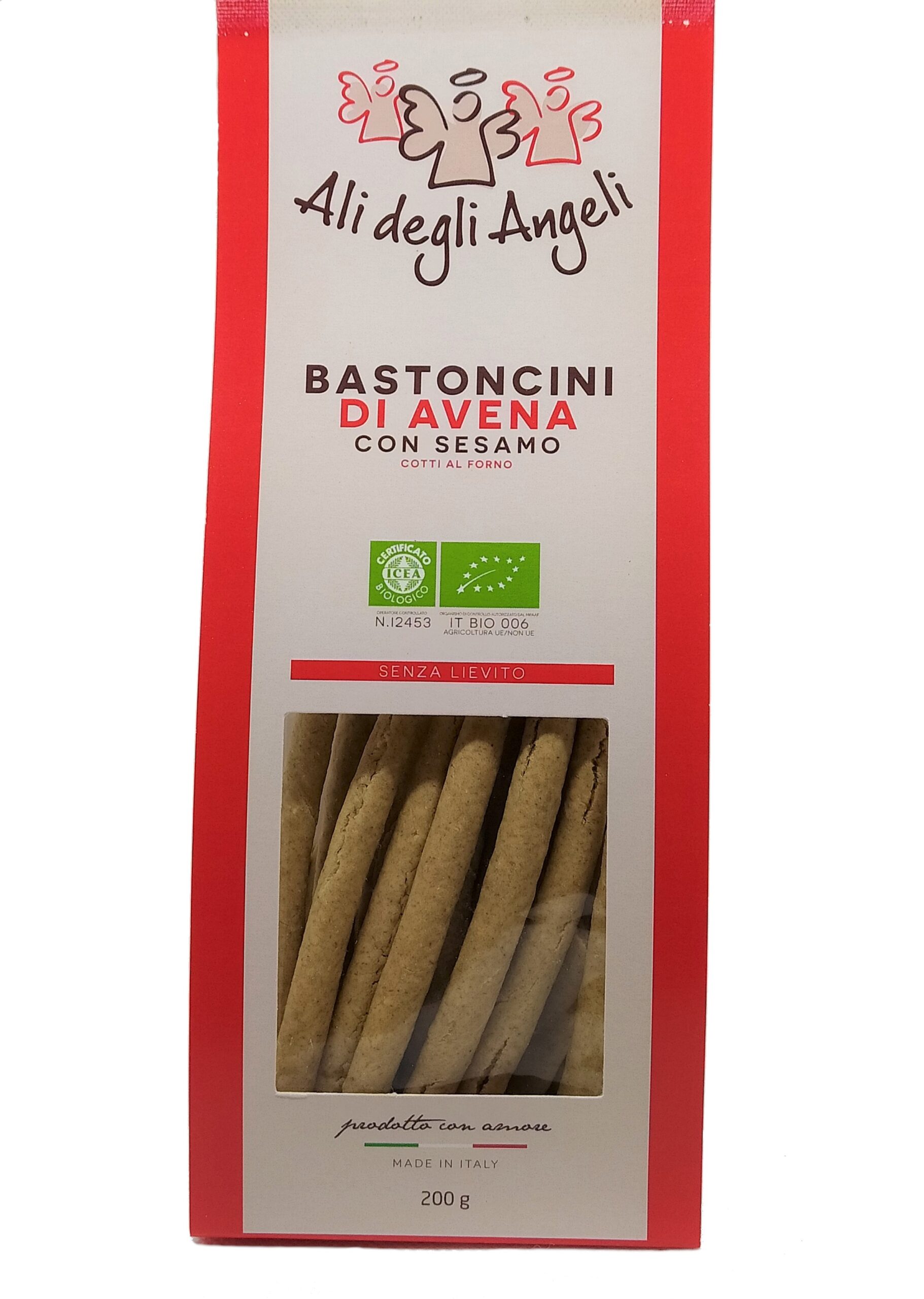 Piccoli grissini di avena con sesamo, friabili e dal sapore delicato, sono particolarmente leggeri e digeribili grazie all’assenza di lievito. Ricchi di proteine e di fibre, 100% vegetali.