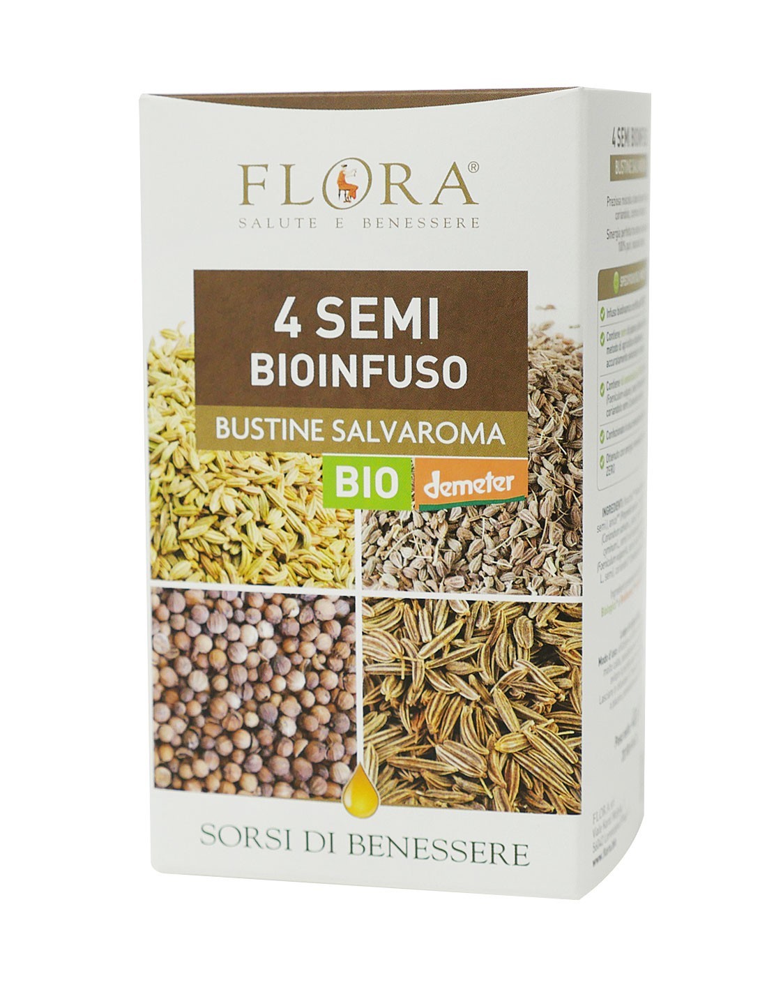 Il BioInfuso 4 Semi è una preziosa miscela digestiva a base di finocchio, anice, coriandolo e cumino provenienti da agricoltura biodinamica controllata. La pregiata miscela è composta esclusivamente dalle parti specifiche delle piante indicate, accuratamente selezionate e macinate.