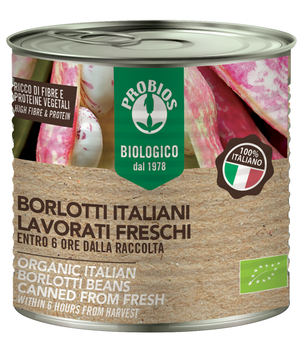 I Borlotti italiani lavorati freschi Probios sono fagioli biologici italiani di qualità borlotti pronti all’uso, lavorati da materie prime fresche 100% italiane. Il gusto genuino di questi fagioli borlotti deriva dalla loro lavorazione entro 6 ore dalla raccolta, che ne mantiene inalterati freschezza e sapore. Garantiti senza glutine e senza zuccheri aggiunti, sono ricchi di fibre e proteine vegetali. Disponibili in lattina di alluminio da 400g.