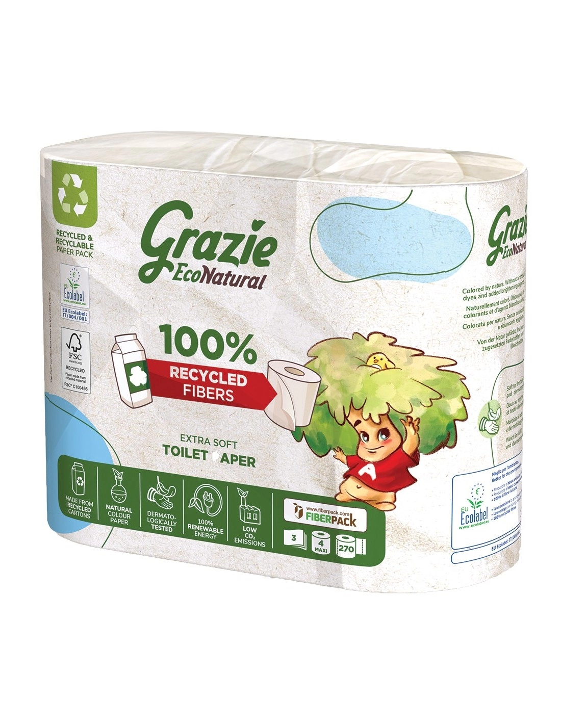 La Carta Igienica Grazie Natural 4 rotoli maxi è realizzata in Fiberpack, materiale innovativo, riciclato ed ecologico, derivato dal completo recupero delle fibre di cellulosa presenti nei cartoni per bevande. La fibra riciclata non subisce trattamenti chimici di sbiancamento e presenta di sua natura una colorazione più scura del normale. La Carta Igienica Grazie Natural è un prodotto certificato Ecolabel, morbida al tatto e dermatologicamente testata. Ogni strappo è a triplo velo, per assicurarti tenuta e assorbenza. Scopri l’innovativo packaging in carta, amico della natura!