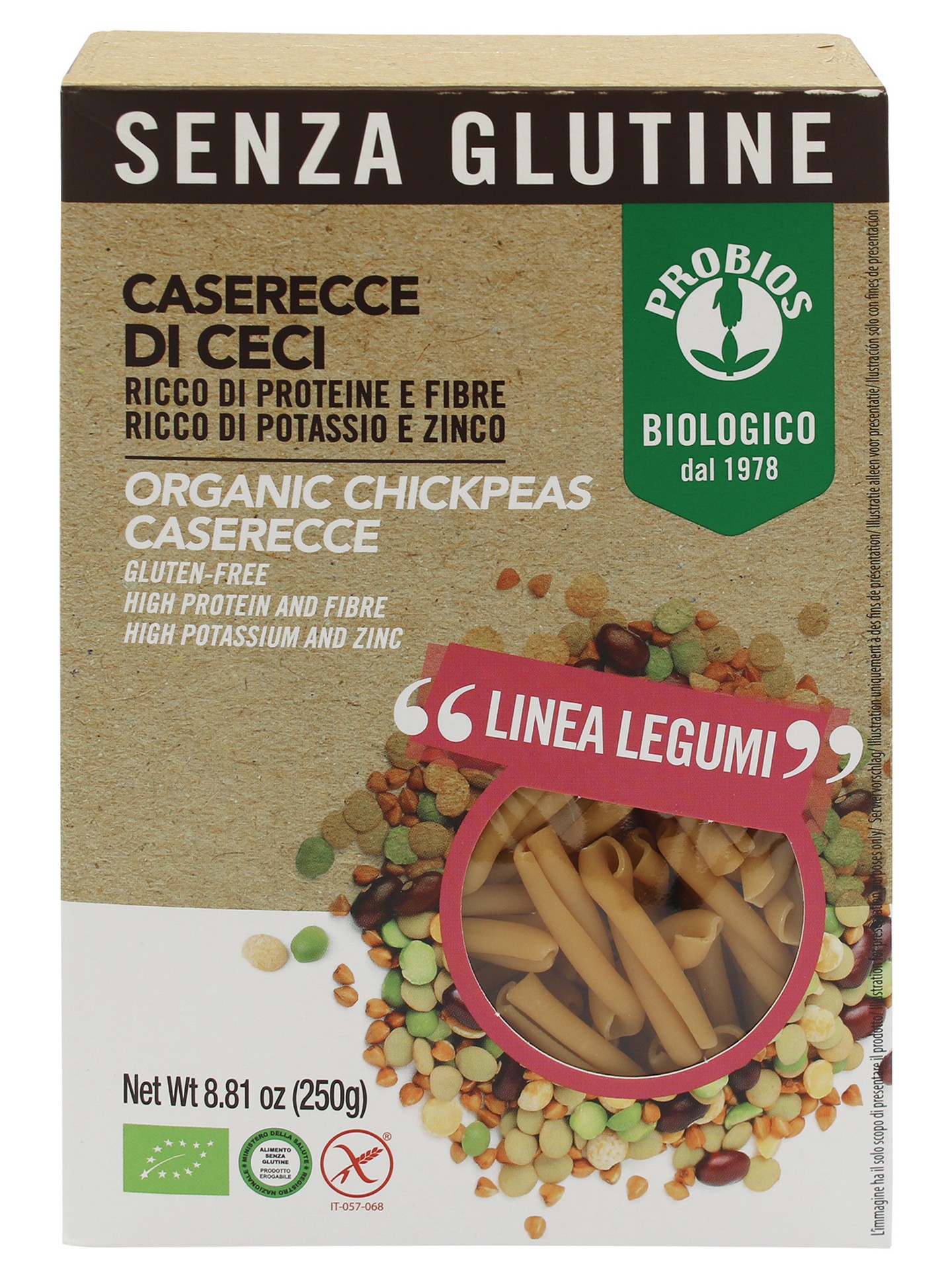 Probios propone una novità totalmente biologica e garantita senza glutine, ideale per la dieta celiaca e per coloro che desiderano variare il loro pasto con un gusto nuovo: le prime caserecce 100% ceci garantite senza glutine, vegan e prodotte in Italia. Tutta la sapienza dei mastri pastai del bel paese, per questa specialità fonte di fibre. Questo prodotto è fonte di proteine. Le proteine contribuiscono al mantenimento della massa muscolare.