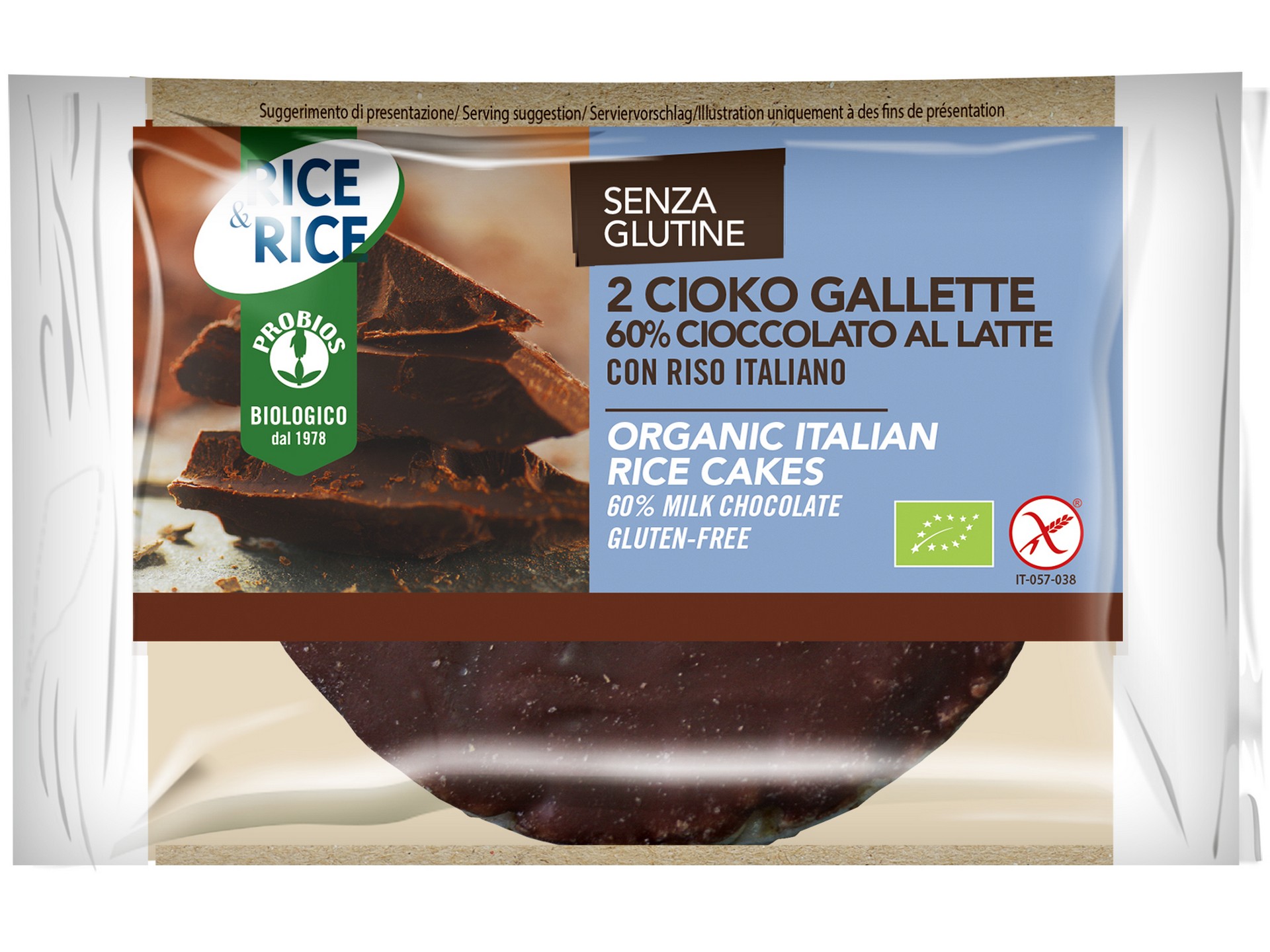 Deliziose gallette di riso italiano ricoperte con il 60% di cioccolato al latte. Confezionate in duopack è uno snack gustoso e adatto ad una pausa in qualsiasi momento della giornata. Il prodotto è garantito senza glutine.