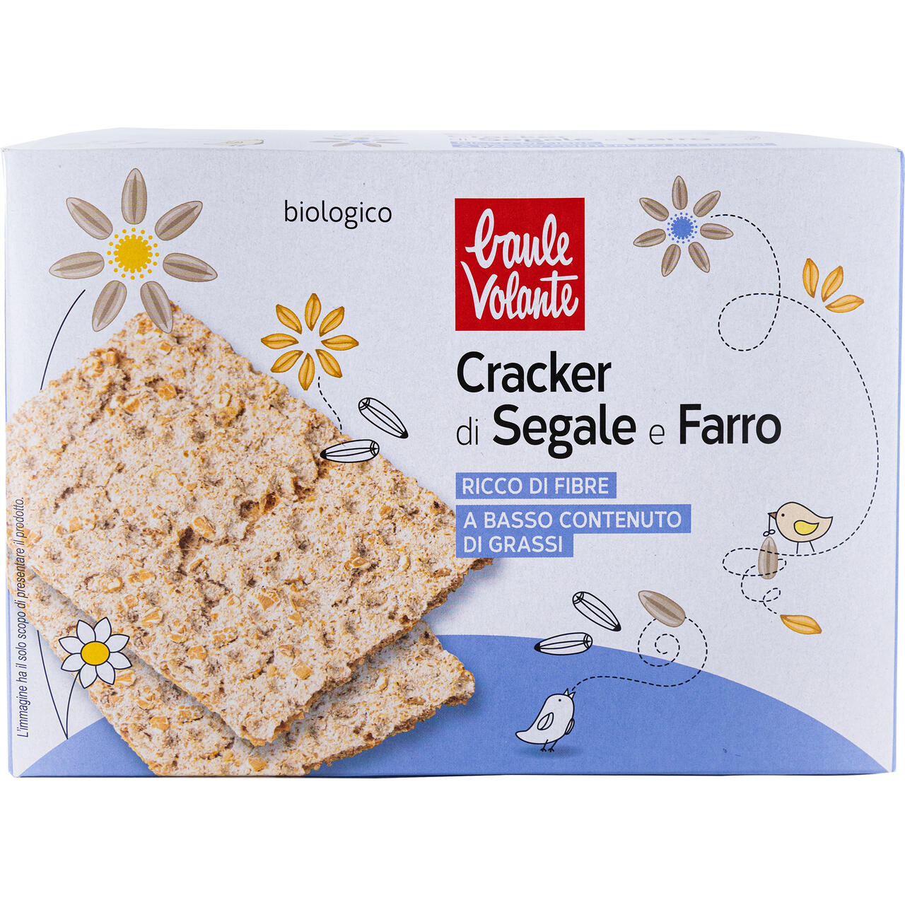 I Cracker di Segale e Farro di Baule Volante sono un croccante prodotto da forno, realizzato secondo una ricetta tipica del Nord Europa.