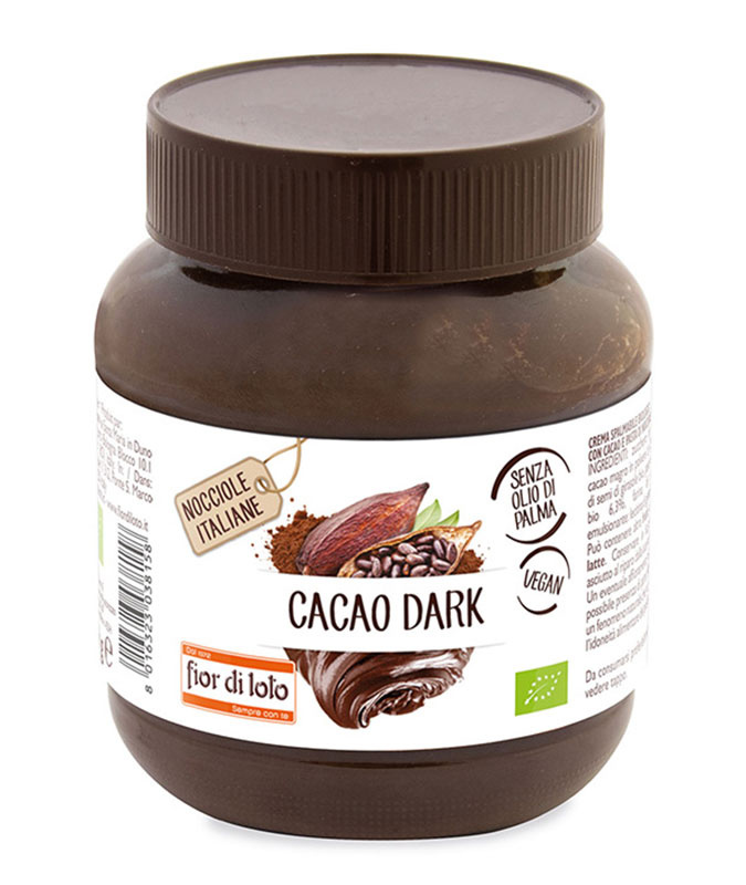 La crema Cacao Dark di Fior di Loto è una golosa crema spalmabile a base di cacao e nocciole: 100% vegan, biologica, senza latte e senza olio di palma.