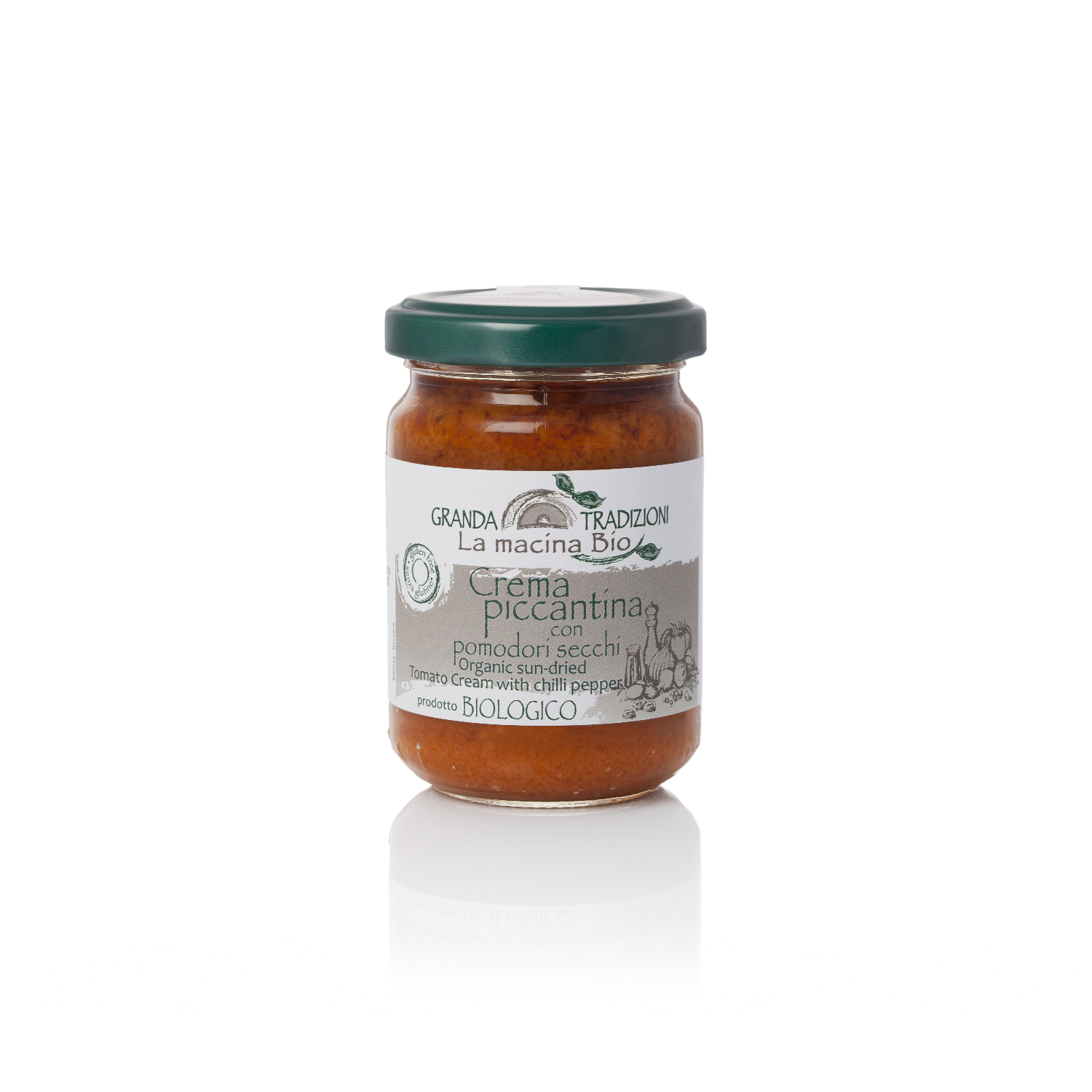 La Crema Piccantina con pomodori secchi La Macina Bio sprigiona tutto il suo aroma mediterraneo. Ottima se inserita nella guarnizione di crostoni o pane abbrustolito, si presta molto bene anche come ingrediente in sughi rustici e per la preparazione della pasta.