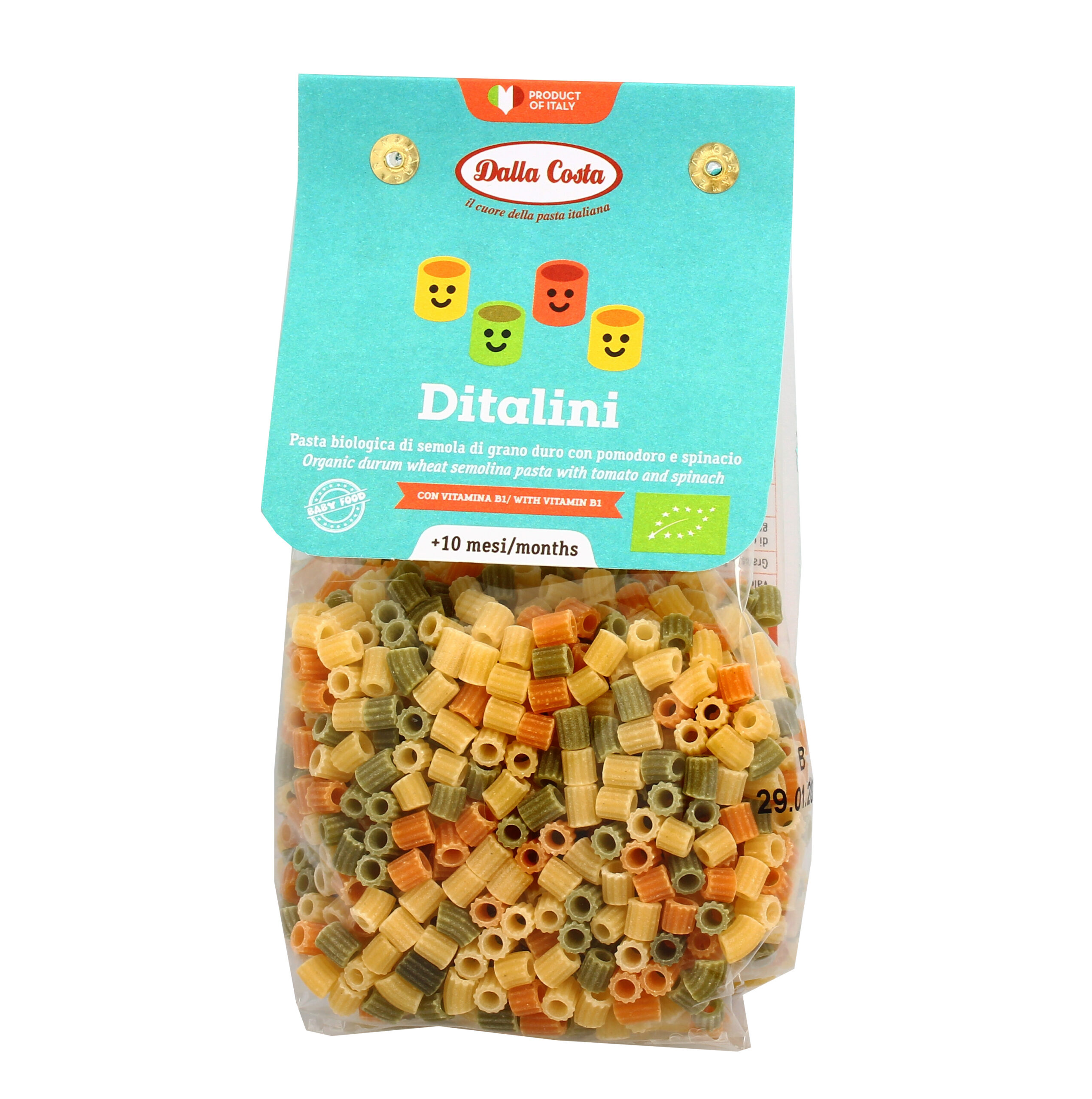 Questi Ditalini Dalla Costa sono una pasta biologica di semola di grano duro con pomodoro e spinaci.