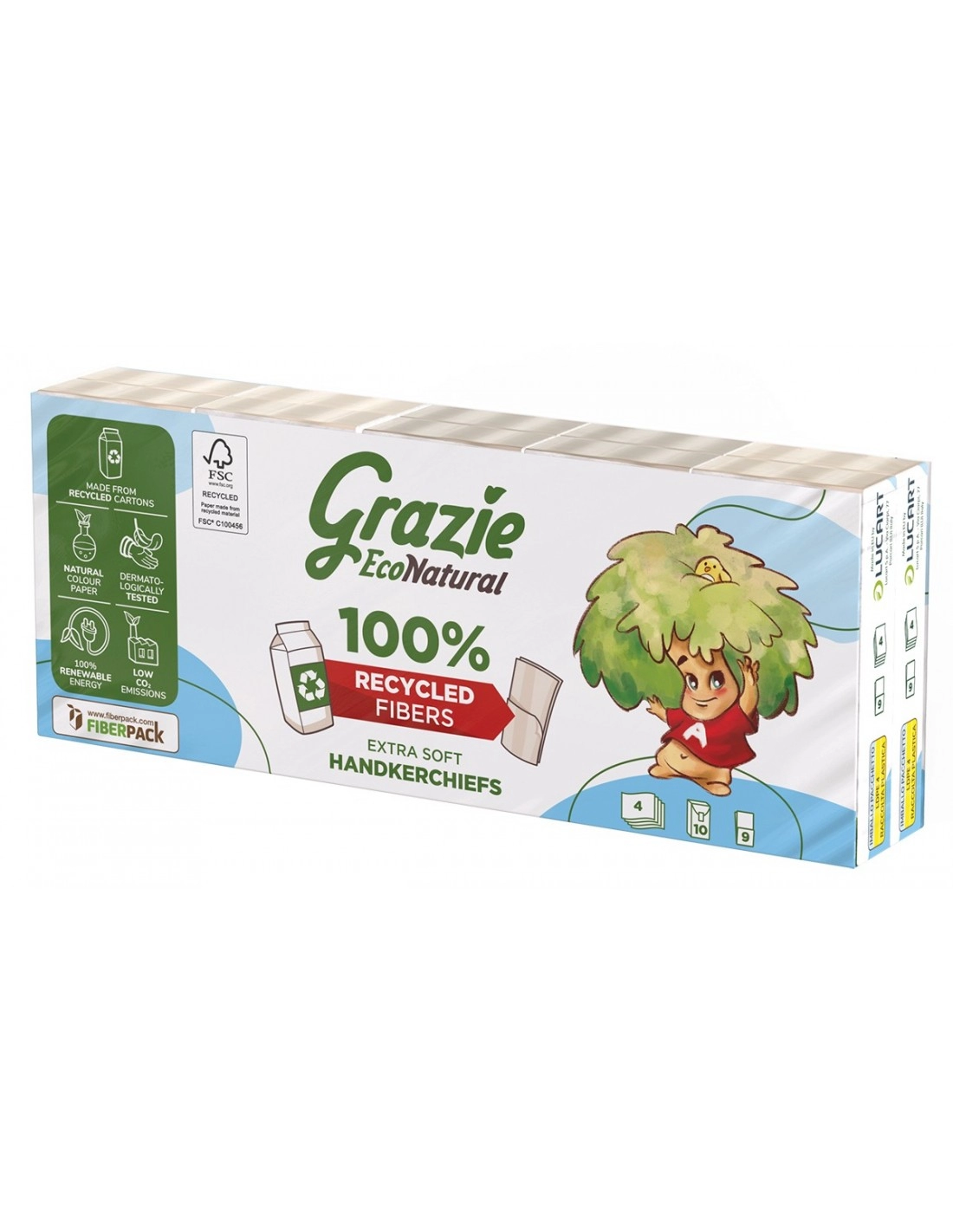 I Fazzoletti Grazie Natural sono realizzati con carta 100% riciclata, ottenuta dalla fibra di cellulosa dei cartoni per bevande. Non essendo sottoposta a trattamenti sbiancanti, la fibra riciclata presenta naturalmente una colorazione più scura della norma. Certificati Ecolabel, i Fazzoletti Grazie Natural rappresentano un prodotto ecologico adatto per ogni esigenza. Sono disponibili nella confezione da 10 pacchetti. I 4 veli garantiscono resistenza, assorbenza e morbidezza.