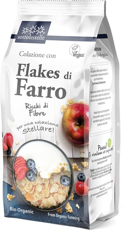Fiocchi biologici croccanti a base di farro integrale. Sono cotti con estrusore che, partendo dall”impasto ricavato dalla farina, consente di ottenere la forma desiderata. Dolcificati naturalmente con sciroppo di mais biologico, ideali per una sana colazione ricca e gustosa. Croccanti e leggeri, ottimi con bevande o yogurt vegetali.
