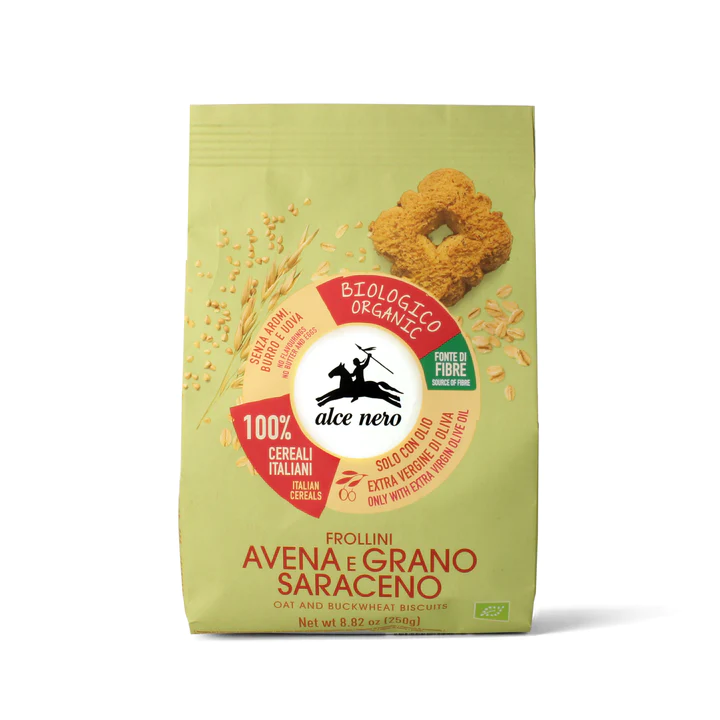 I Frollini di avena e grano saraceno biologici Alce Nero sono realizzati utilizzando solo olio extra vergine di oliva. Hanno una ricetta composta da pochi ingredienti, senza aromi né prodotti di origine animale come burro o uova. Questi frollini si caratterizzano per essere fonte di fibre, magnesio, rame e zinco, ricchi di fosforo e per essere prodotti con cereali 100% italiani.