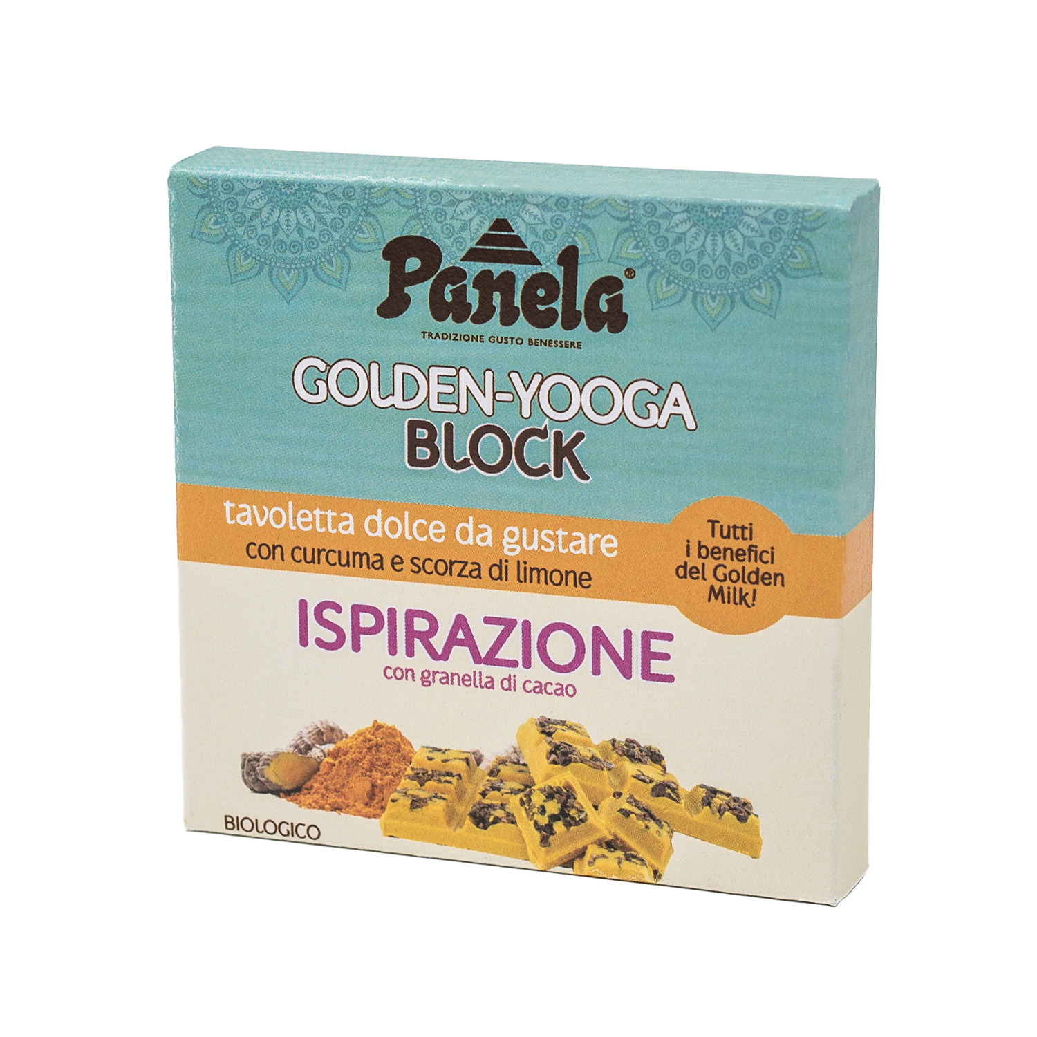 Tavoletta con granella di cacao, curcuma, zenzero e scorza di limone. Croccantezza rigenerante! Gusto avvolgente, sapore speziato e la vivacità del sole. Ecco tutti i benefici del Golden Milk in una pratica tavoletta, ideale per chi fa sport o yoga. Ricarica di vitalità a qualsiasi ora. Biologico.