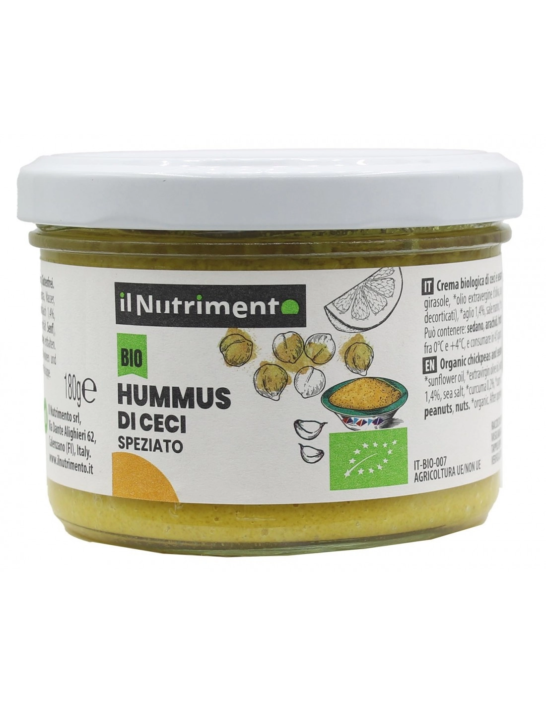 *ceci 52%, *olio extravergine d’oliva, acqua, *succo di limone, *tahin 5,2 % (*semi di SESAMO decorticati), *aglio, sale, *curcuma 0,2%, *curry 0,1% ( miscela di spezie, contiene SENAPE), *cumino. *biologico.
