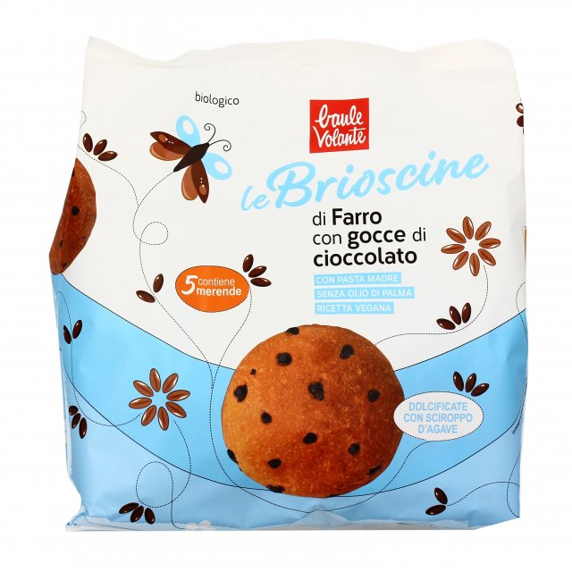 Golose e irresistibili, Le Brioscine di Farro con Gocce di Cioccolato di Baule Volante sono delle merendine biologiche realizzate tramite ricetta vegan.