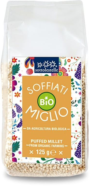 Il Miglio Soffiato è ottenuto dalla lavorazione del cereale tal quale, prodotto con il classico sistema di cottura ad alta pressione e successiva espansione. Conserva inalterate le caratteristiche nutrizionali della materia prima da cui deriva. Da gustare a colazione con latte, yogurt e loro alternative vegetali.