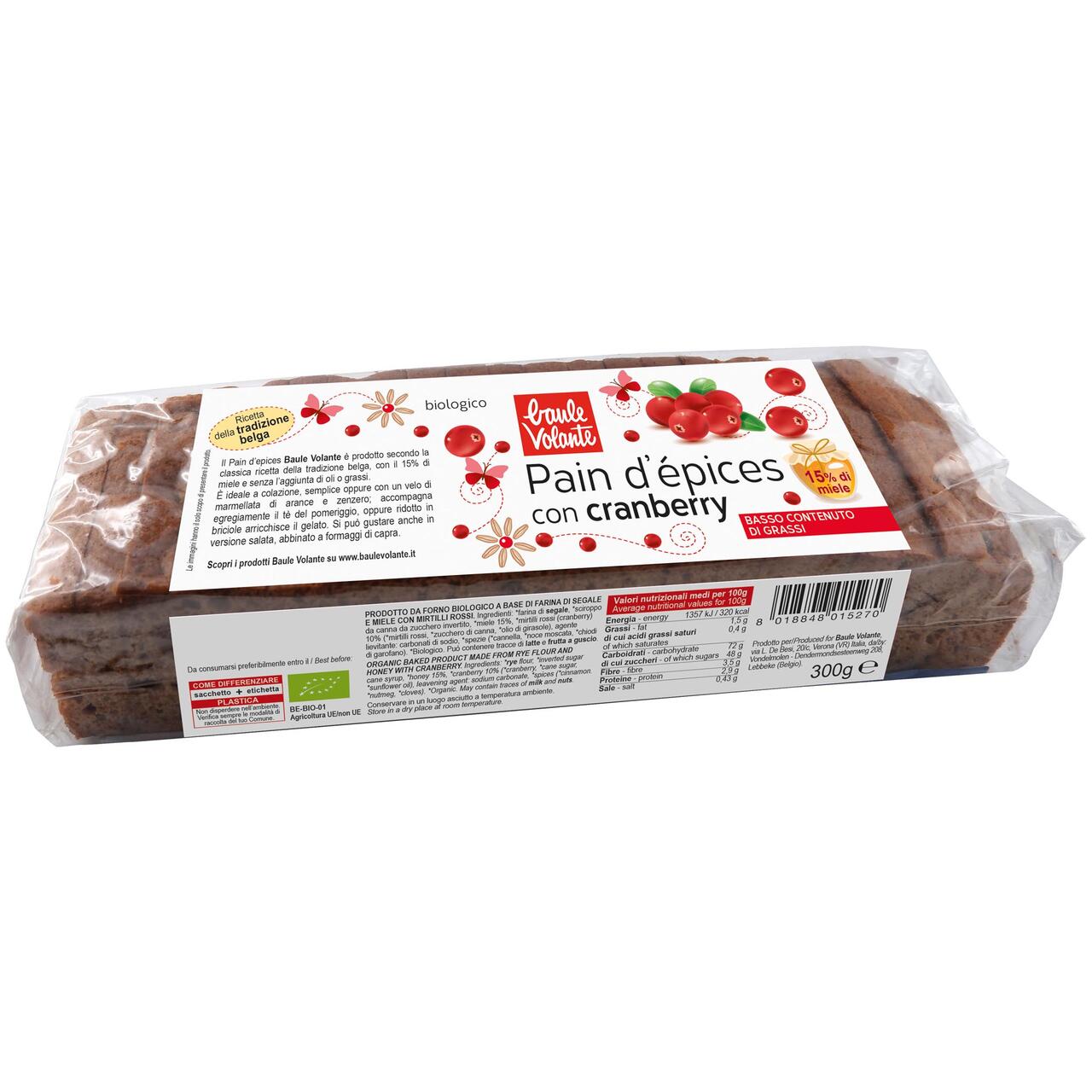 Farina di segale* 36%, sciroppo di zucchero invertito*, miele* 15%, mirtilli rossi* (cranberry) 10% (mirtilli rossi*, zucchero di canna*, olio di girasole*), agente lievitante: carbonati di sodio, spezie* (cannella*, noce moscata*, chiodi di garofano*). (*da agricoltura biologica)