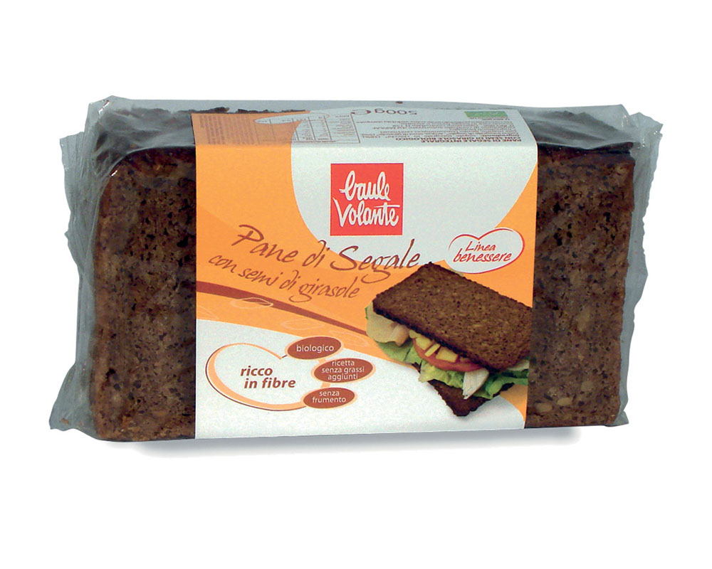Il Pane di Segale Integrale con Semi di Girasole Baule Volante è una specialità a base di segale integrale. Fonte di fibre, ideale come sostitutivo del pane bianco. La presenza dei semi di girasole garantisce un apporto di acidi grassi insaturi, sia polinsaturi (acido linoleico – omega 6) che monoinsaturi (acido oleico – omega 9); notevoli anche i livelli di fitosteroli e vitamina E (liposolubile).