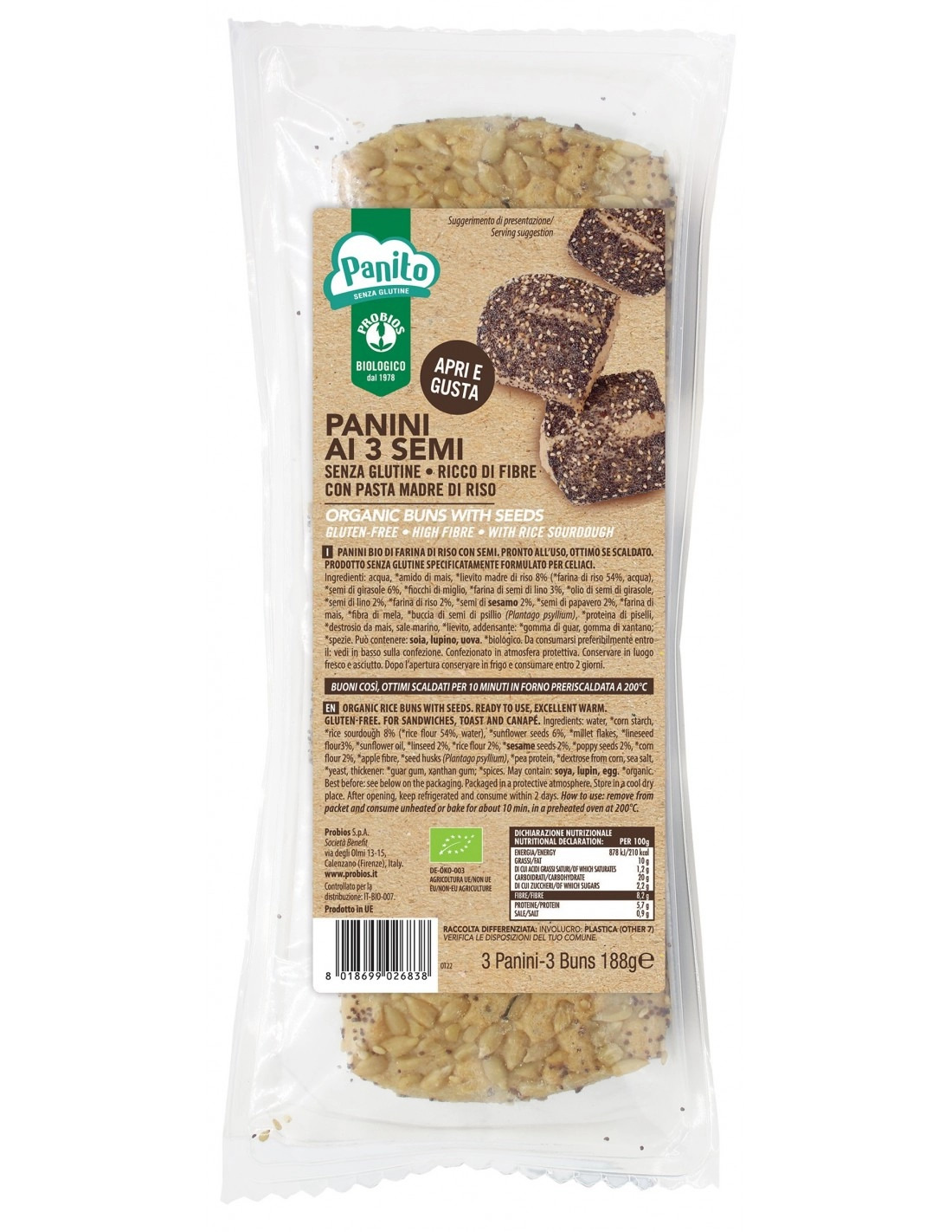 I Panini ai Tre Semi Panito Probios sono la nuova proposta senza glutine, in una pratica confezione apri e gusta contiene 3 panini da farcire come preferisci o per accompagnare il tuo pasto! Biologici, ricchi di fibre e con pasta madre di riso, sono buoni così oppure ottimi se scaldati 2 minuti in forno o nel tostapane.