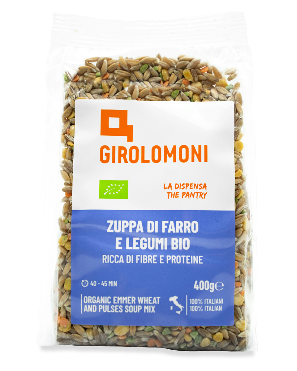 La Zuppa di Farro e Legumi Bio di Girolomoni è preparata con ingredienti da agricoltura biologica italiana.