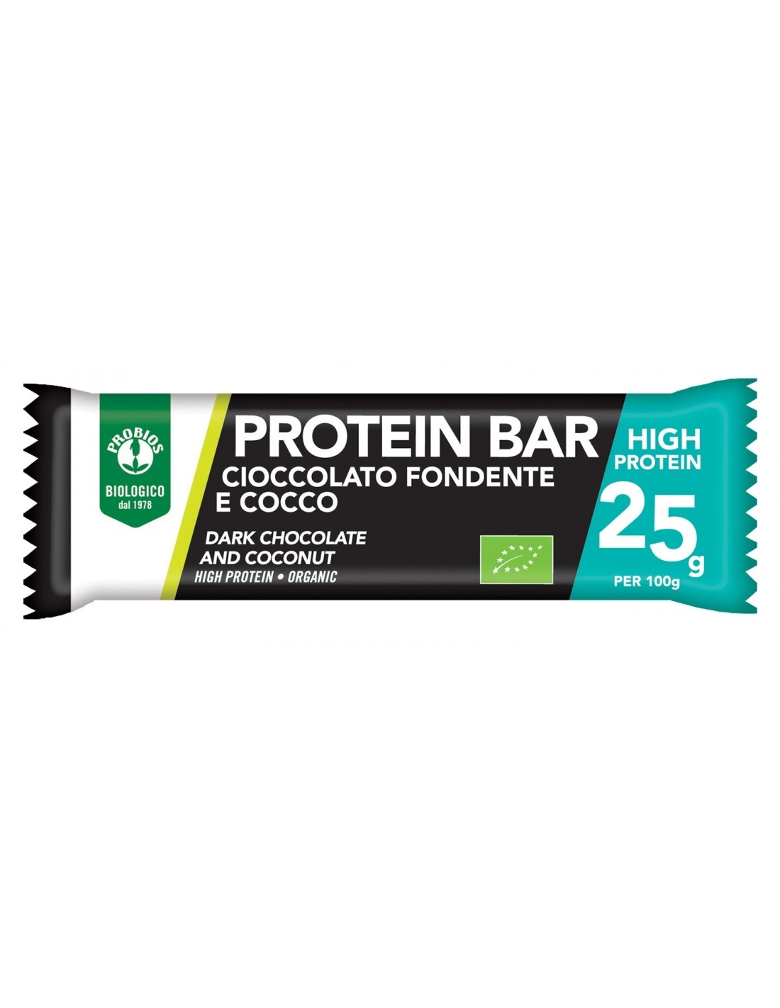 Protein Bar cioccolato fondente e cocco Probios, unisce il gusto fresco del cocco alla croccantezza del cioccolato in questa barretta ad alto contenuto proteico (25g/100g) e fonte di fibre. Per potenziare il tuo allenamento e nutrire i tuoi muscoli, con un prodotto biologico, senza glutine e made in Italy.