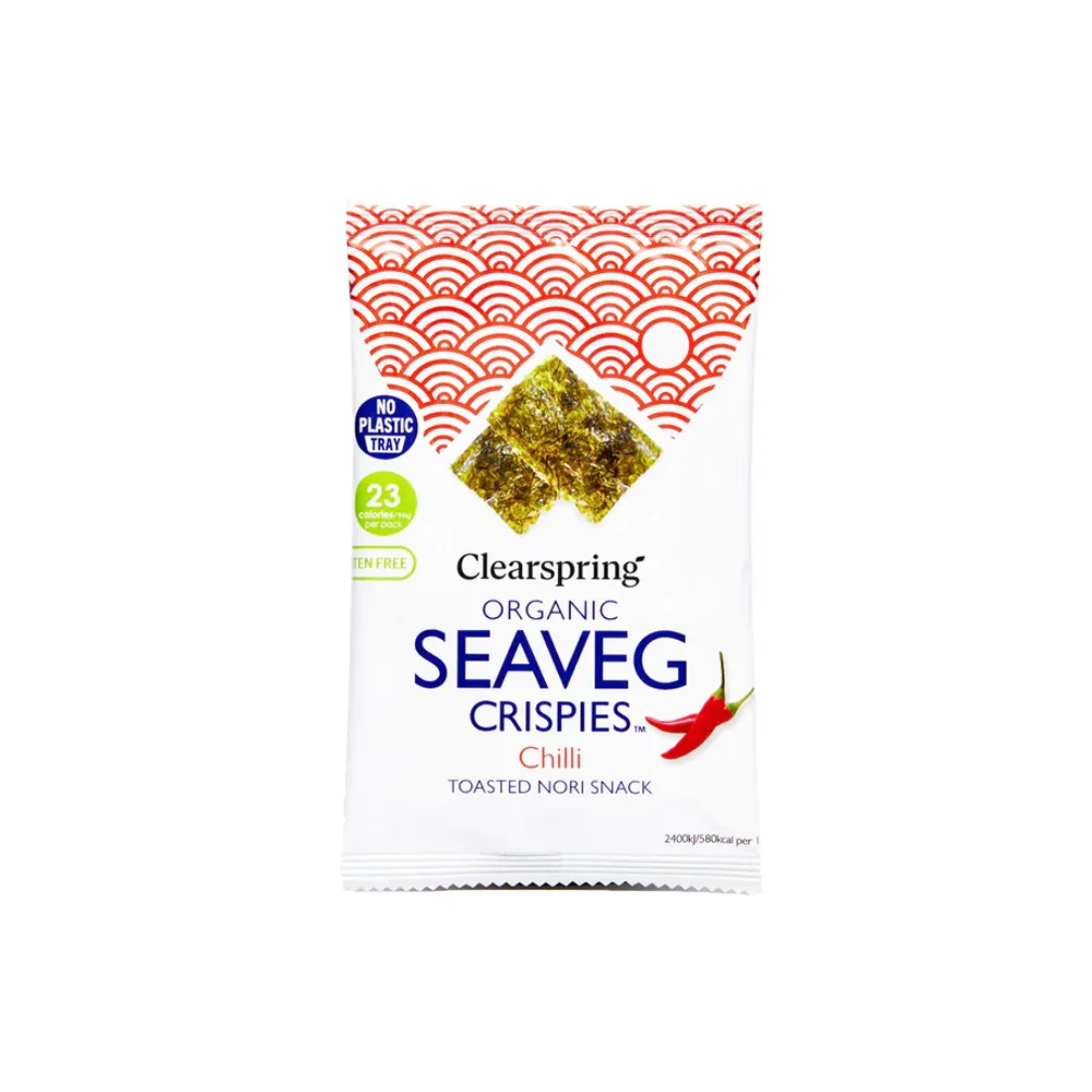 Seaveg Crispies Chili è lo Snack di Alga Nori Tostata con Peperoncino Bio di Clearspring, perfetto per chi ama un gusto leggermente piccante!