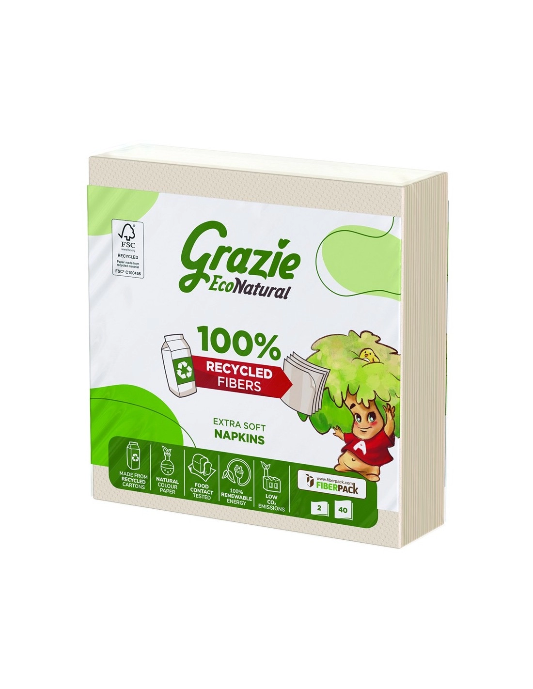 I Tovaglioli Classici Grazie Natural sono realizzati con carta 100% riciclata, ottenuta dalla fibra di cellulosa dei cartoni per bevande. Non essendo sottoposta a sbiancamenti chimici, la fibra riciclata presenta di sua natura una colorazione più scura del normale. Prodotto certificato Ecolabel, i Tovaglioli Classici Grazie Natural rappresentano la soluzione ecologica ideale per ogni occasione. Sono disponibili nel formato da 40 pezzi doppio velo, per garantire extra resistenza e ultra assorbenza.